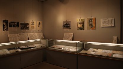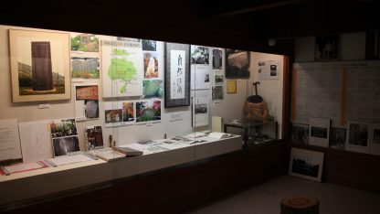 高浜虚子の孫にあたる稲畑汀子さんの自宅横に2000年に建てられた『虚子記念文学館』。1Fに受付があり、2Fにあがると常設展示室と企画展示室があります。常設展示では、虚子の幼い頃から晩年について展示されており、自筆の句や有名な弟子達の作品、愛用のメガネなどを見ることができます。企画展示は半年ごとに企画され、取材時は能を愛した虚子の側面にスポットライトをあて「虚子と能楽」というコンセンプトで展示されていました。また、図書室には数え切れない俳句の専門書や、昔の俳句の雑誌などがあったそうなので、俳句好きの方にはおすすめです。