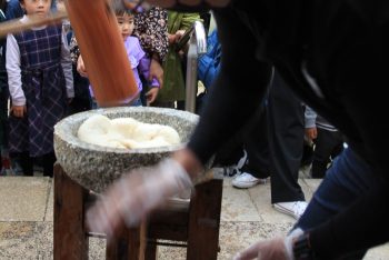 午後からの雨模様で、だんじりの巡行は中止となりましたが、本通りでのだんじりパレード、大桝公園での餅つき、物販・飲食の屋台や射的などがにぎわいました。