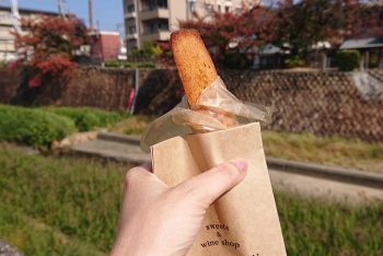 撮影中にフィナンシェがちょうど焼き上がり、いい香り♪外側はサクっと、中はし~っとり。持ちやすいスティック型なので、春に芦屋川で桜を眺めながら食べるのも良さそうです。