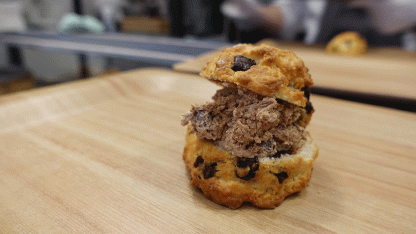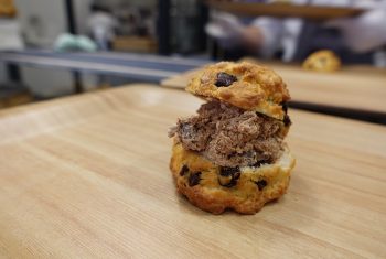 どれもおいしそうで、試食で食べるスコーンを選ぶのにかなり迷ってしましました。時間をかけて決めたのが「チョコチップ」のモイストスコーンに、「ダブルチョコレート」のバターをサンドする組み合わせです。「ダブルチョコレート」バターの中にはパリパリ触感のチョコレートが入っていて、たっぷりチョコを楽しむという贅沢な味わいです。