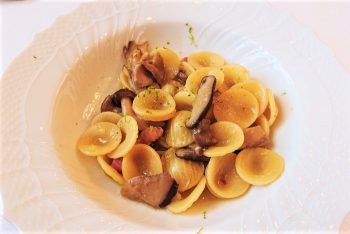 次はスープかパスタを選びます。秋らしいメニューの中から選んだのは「ボスカイオーラのオレキエッテ」。ボスカイオーラはきのこのソース、オレキエッテは丸いショートパスタです。