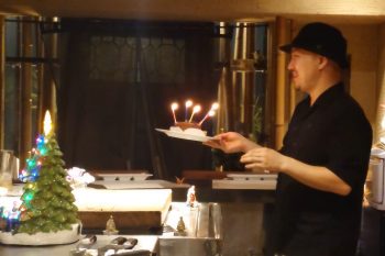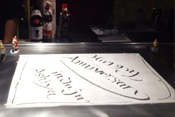 ここでお客様のお誕生日ということで、音楽とともにサプライズプレゼントのケーキ登場!隠されていた鉄板にはお塩でできたソルトアートメッセージも。お店の雰囲気もとてもいいので、記念日やお誕生日におすすめです。