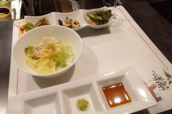 最初はサラダとママさんの手作り前菜3種です。お酒を飲みながらつまむのにぴったり。