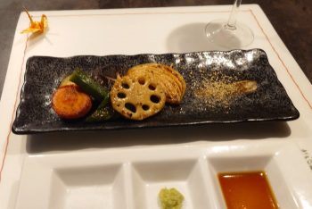 左のアミューズはカリフラワーのムースにあぶったタラの白子。かかっているのは但馬太田牛のコンソメから作ったジュレ。まろやかでクリーミーで、デザートを食べたのかと思ったくらいふんわりした甘味と舌ざわりが最高。