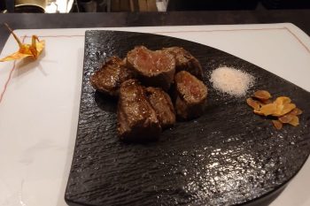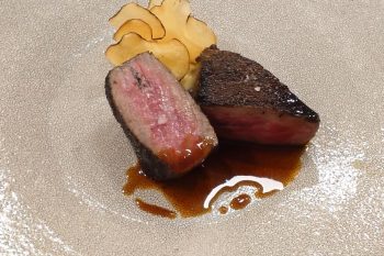 そして但馬の太田牛、雌のサーロインステーキ!こちらは炉釜の炭火で焼くので、しっかり焼けた外側に旨味も肉汁も中に閉じ込められた感じがすごい!添えられているカブのピューレと山の芋チップスもお肉の味を引き立てます。