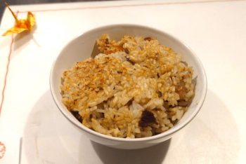 ガーリックライスにもお肉がたっぷり。お茶碗に盛り付けて、ちょっと残した?と思ったらおこげを作っていました!