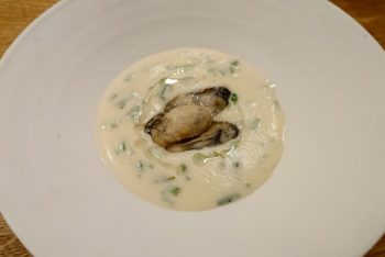スープは坂越のカキのムニエル冬野菜のポタージュです。バターの香りがたまりません。冬野菜はセリが入っていました。