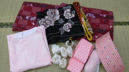 教室では着物を始め、たくさんの必要品も教室で用意されています。だから、何をどう用意したらいいのかまったく分からない方も安心。今日は普段着の着物の中から恵利加さんがセレクトしました。必要なものは、肌襦袢、裾除け、紐5本、衿芯、帯、帯板、帯枕、帯締め。やっぱりたくさんのものが要るんですね。※足袋と肌着は入会時に貰えます。