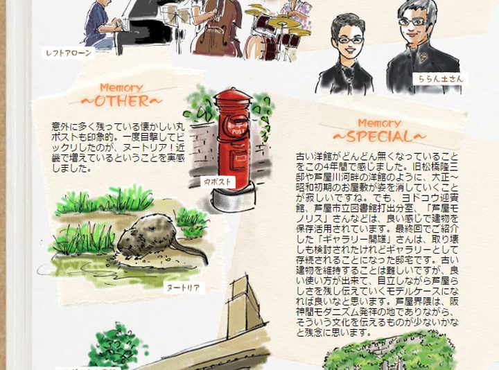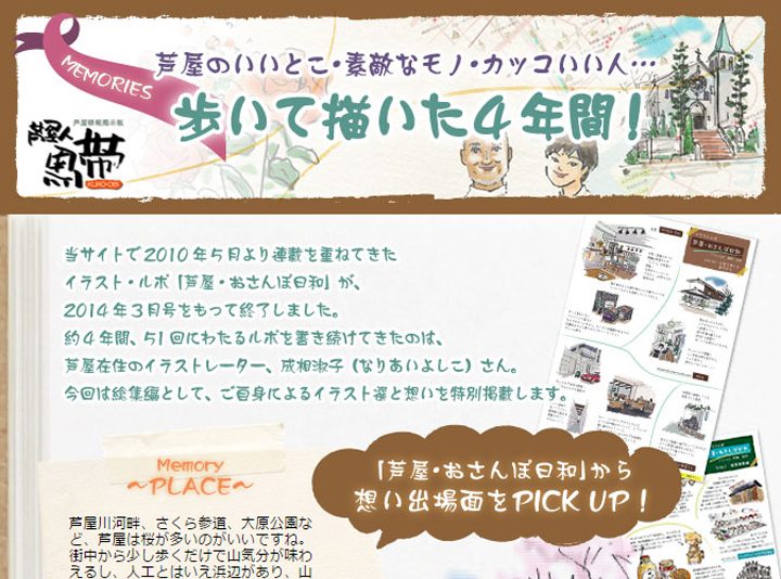 当サイトで2010年5月より連載を重ねてきたイラスト・ルポ「芦屋・おさんぽ日和」が、2014年3月号をもって終了しました。
