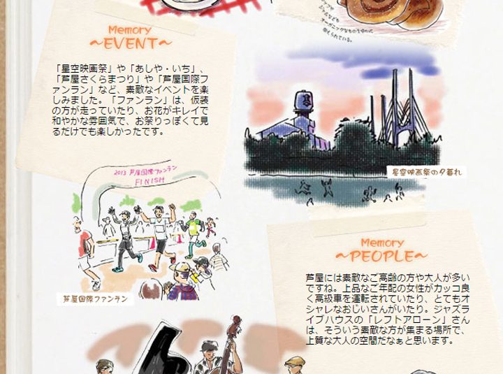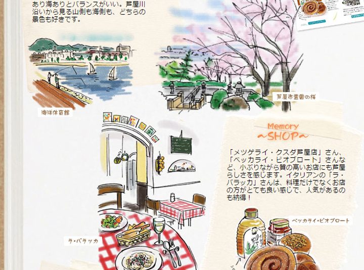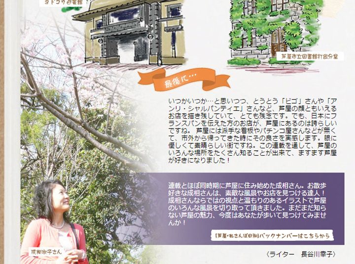 連載とほぼ同時期に芦屋に住み始めた成相さん。お散歩好きな成相さんは、素敵な風景やお店を見つける達人!成相さんならではの視点と温もりのあるイラストで芦屋のいろんな風景を切り取って頂きました。まだまだ知らない芦屋の魅力、今度はあなたが歩いて見つけてみませんか!