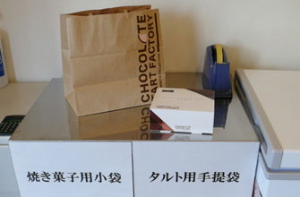 包作業台で、下にあるタルト用手提げ袋または焼き菓子用小袋を選んで入れます。