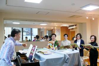 本日の講座は、美しい歌声でイタリア声楽曲などを歌う「ベルカントⅡ」。グランドピアノを弾きながら指導されているのは、主宰者であり、オペラ歌手の伊藤正氏です。時々、お手本として歌われるバリトンの力強い声はさすが!現役声楽家に教えて貰えることの贅沢さを実感しました。2時間のレッスンでは、発声をして声を温めてからいくつかの歌曲をみんなで歌っていきます。コーラス経験者の方もいらっしゃいますが、譜面が読めなくても、イタリア語が出来なくても問題ないとのこと。レッスンを重ねていく内に、初めはなかなか出なかった声が出てくるようになり、音域も広がっていくそうです。