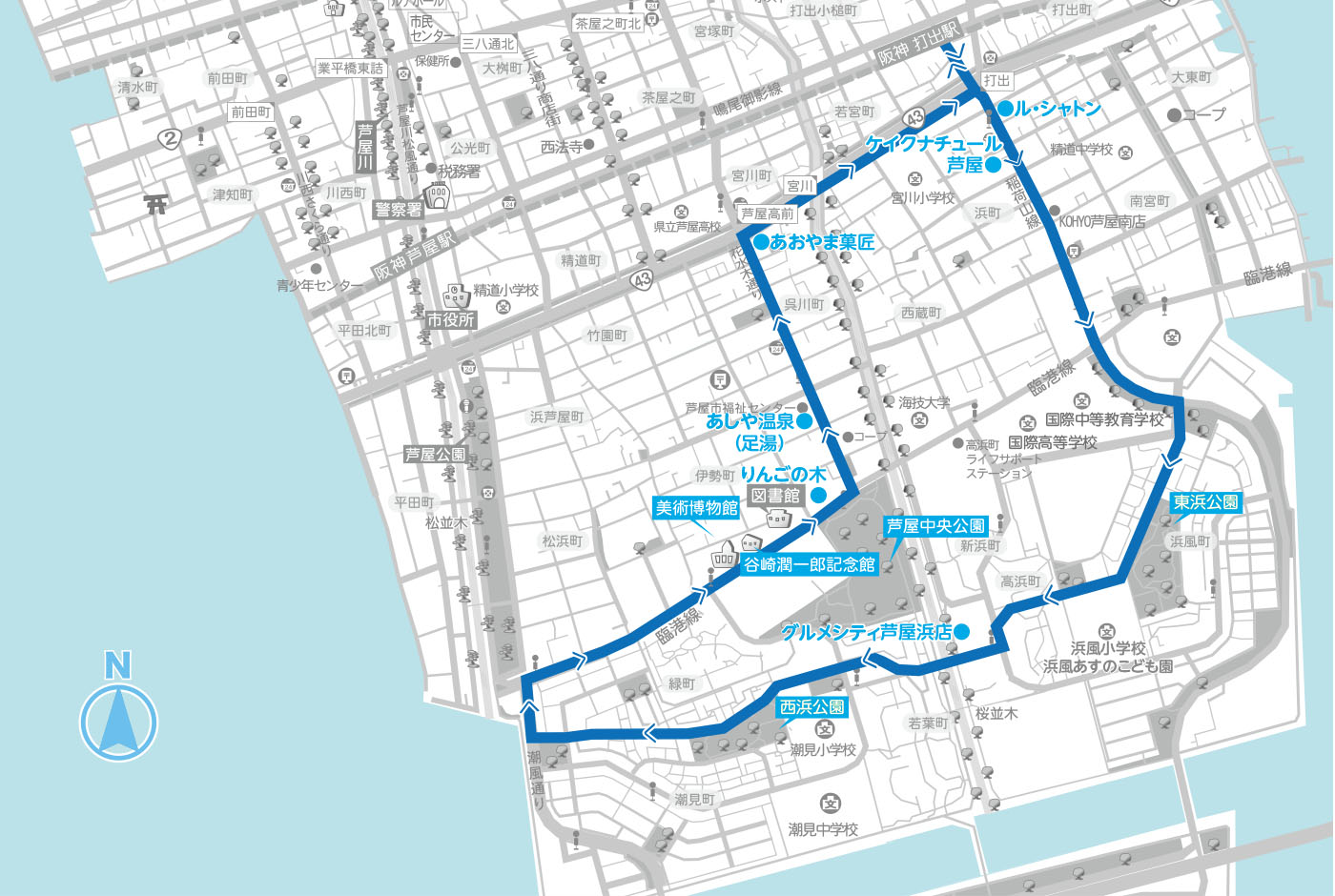 阪神打出駅から芦屋浜中央緑道を通るコース