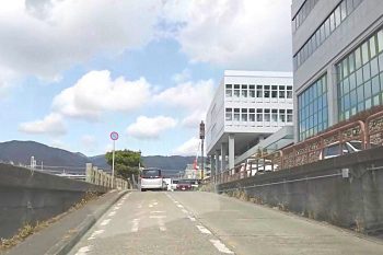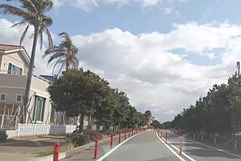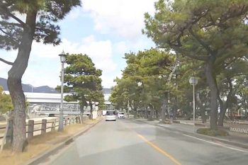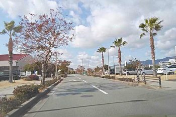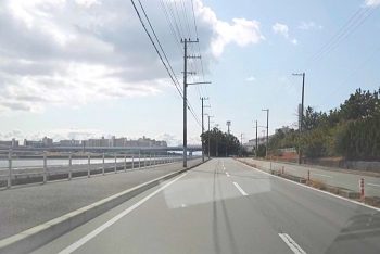 潮風大橋を渡る元の道に戻って進むと、総合公園が見えてきます。この交差点は日産サクラのCMで車が走っている撮影に使われていました。