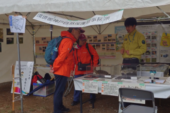 環境省と東お多福山草原保全再生研究会のブースでは六甲山系の動植物についての展示です。お花の塗り絵もできました。