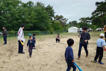 キャップ野球はちょっと頭を使う、ペットボトルのキャップを使った野球です。大会も行われる競技なんですよ。これもちびっこが大興奮!