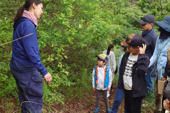 「森の探検隊&間伐材バッジづくり」はまず森の探検隊が出発。神戸大学農学部の学生さんが山の植物について教えてくれます。